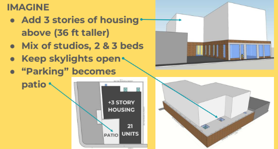 Located at 10 Harvard Street in Dorchester, the ReGen Center will transform an existing 13,550-square-foot warehouse currently home to Bikes Not Bombs, Agricultural Hall, and Boston Restore Inc. The structure features 18-foot ceilings and ample exterior space, providing a flexible foundation for mixed-use redevelopment. Concept designs envision three additional stories of income-restricted and supportive housing (approximately 21 units) above a revitalized ground floor that will serve as a Clean Energy Community Resilience Hub (CCRH) and community anchor.
